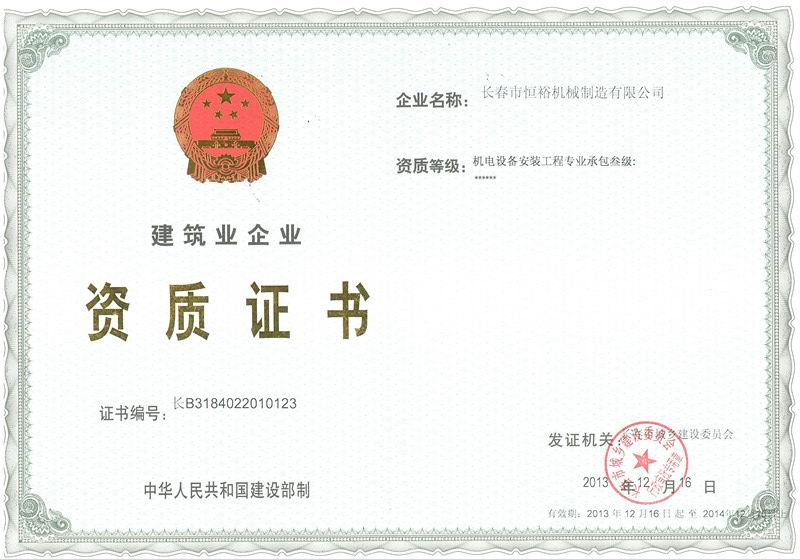 熱烈慶祝長春市恒裕機械制造有限公司2013年12月獲得國際焊接認(rèn)證資質(zhì)證書和機電安裝資質(zhì)證書