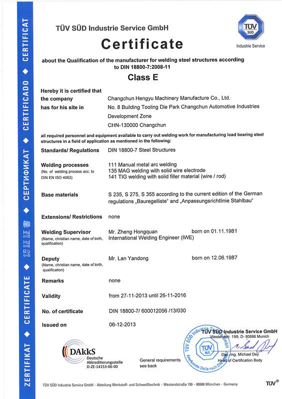 2013年12月我公司歷時半年時間,分別獲得了DIN18800-7國際焊接認(rèn)證證書和機電安裝三級資質(zhì)證書,在一汽大眾公司的許多合作伙伴中,我們是率先獲取的這兩項資質(zhì)認(rèn)證的,為我們今后與大眾合作打開了便利通道,獲得DIN18800-7國際焊接認(rèn)證資質(zhì),使我們可以承接大的鋼結(jié)構(gòu),以及歐洲標(biāo)準(zhǔn)要求的焊接項目。