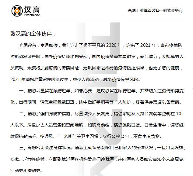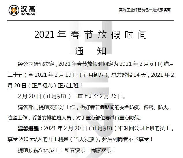 新的一年里,漢高機(jī)械祝大家財(cái)源廣進(jìn),闔家安康?。?!