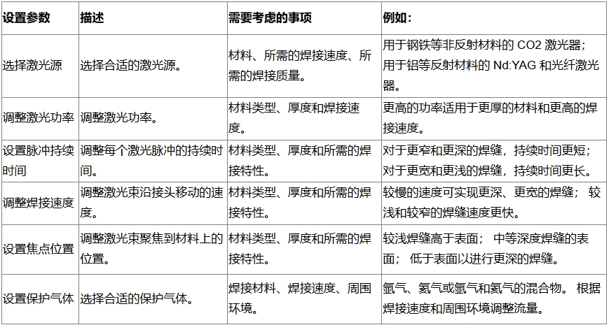 準備好焊接材料后,下一個關(guān)鍵步驟是設(shè)置激光焊接機。 這涉及配置各種參數(shù),例如激光功率、脈沖持續(xù)時間、焊接速度和焦點位置。 這些參數(shù)中的每一個都會顯著影響焊接質(zhì)量,因此根據(jù)材料類型、厚度和所需的焊接特性仔細調(diào)整它們非常重要。