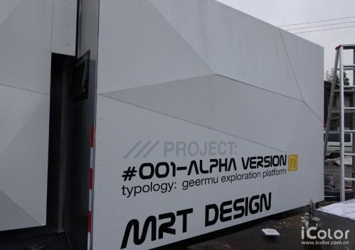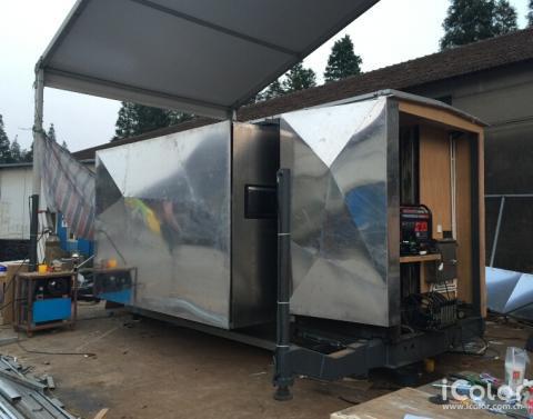 房車(chē)外形——車(chē)廂表皮采用多面拼接,灰白色鋼板使車(chē)體形似石塊,置于草原荒漠之中也顯得和諧而醒目