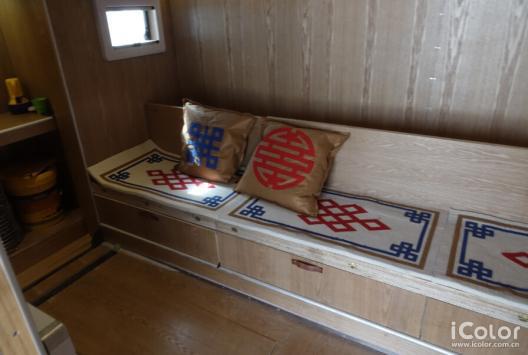 內(nèi)飾——運(yùn)用了蒙古傳統(tǒng)民族圖案及配色,選取當(dāng)?shù)爻S玫难蛎珰肿鳛椴牧希瑯O具地方特色風(fēng)情,而給志愿者們創(chuàng)造出了家的感覺(jué)。