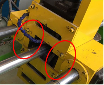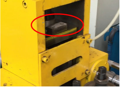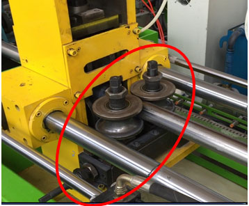 五、漢高正品的立輥合模機(jī)構(gòu)上,采用光軸加鋼套與水平模框嵌入固定;仿制品則隨便用了一組制管機(jī)上的立輥機(jī)構(gòu)。如下圖所示: