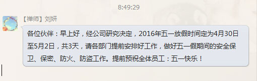 經(jīng)過(guò)公司研究決定,2016年五一放假時(shí)間定為4月30日至5月2日,共3天,請(qǐng)各部門(mén)提前安排好工作,做好五一假期間的安全保衛(wèi)、保密、防火、防盜工作。