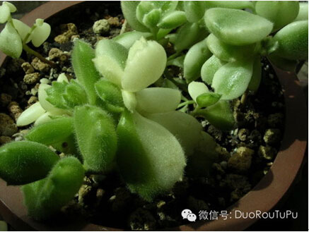 6. 錦:肉肉顏色上的一種變異,多呈現(xiàn)出黃色、白色或粉色。基本上會在名字后面加一個錦字,如XX錦,帶個錦的很難得,一般出錦之后就會身價倍增。如下圖熊童子白錦。